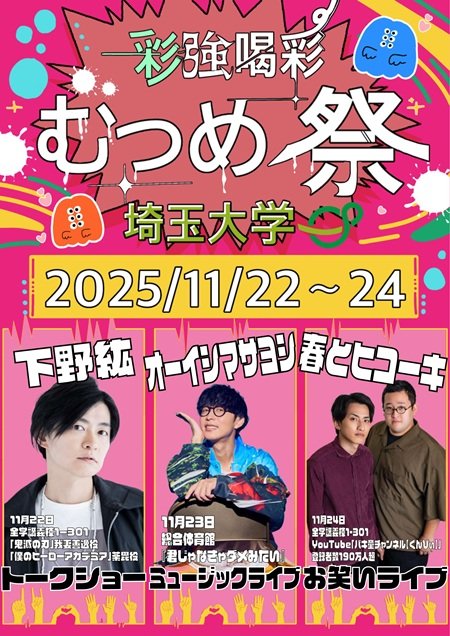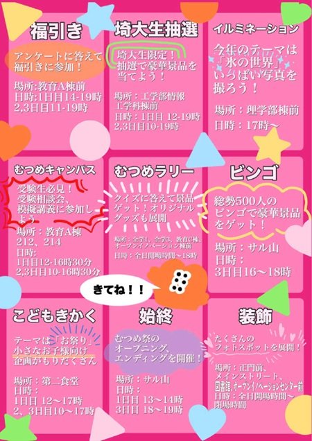 | 埼玉大学祭 「むつめ祭」について 〈開催日時〉 11月22日(土)12:00~19:00 11月23日(日)10:00~19:00 11月24日(月)10:00~19:00 |